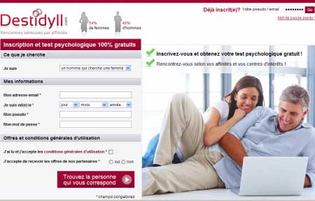 Destidyll vous propose un service de rencontre basé sur les affinités psychologiques. L'inscription permet de recevoir gratuitement un bilan personnalisé sur son profil sentimental. Vous pourrez ainsi faire le point sur le type de relation que vous recherchez ainsi que sur le type de personne qui pourrait correspondre à vos désirs.